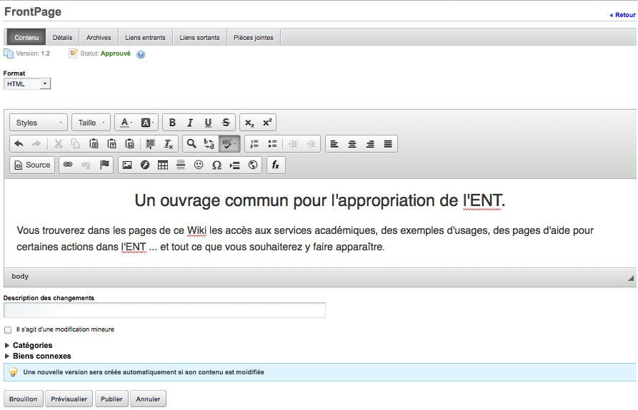 L'éditeur est le même que dans la création de documents à quelques modules près. De ce fait il peut être intéressant de préparer la page dans l'espace de travail sous forme d'un document.html puis de copier coller le contenu dans la page du wiki.